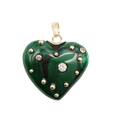 This elegant pendant features a hand-carved green malachite heart accented with gold balls and three VS+ manmade diamonds totaling 0.14 carats. The piece includes a handmade triangle bail and a gold heart on the back, measuring 1.25" x 1" x 0.25". Its refined design combines natural beauty with subtle sparkle, perfect for adding a sophisticated touch to any outfit.