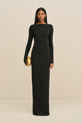 The Rozalia Gown is an elegant maxi dress crafted from smooth matte jersey, offering a flattering silhouette with a high boat neck. Its standout feature is a dramatic deep cowl back accented by a delicate chain detail, adding a refined touch of sophistication. Perfect for formal occasions, this gown effortlessly combines modern style with timeless grace.
