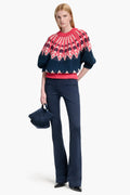 The Marty Sweater features a bold red and blue fairisle pattern with voluminous balloon sleeves that blend classic design with modern style. This short-sleeve knit works beautifully layered or worn alone, making it an effortless choice for any occasion.