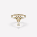 The Pia ring in solid 18k yellow gold showcases a sleek single band design, accented with optional u-pavé white diamonds for subtle brilliance. Featuring three unfixed annulets and a central drop charm adorned with a captivating white diamond, this piece offers elegant versatility. Handmade in Los Angeles, the Pia balances refined craftsmanship with lightweight comfort, making it ideal for everyday wear or for stacking alongside other Spinelli Kilcollin styles.