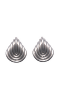 Pair of silver ribbed reverse teardrop earrings on a light gray background