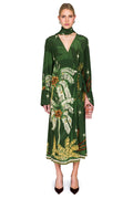 Embrace timeless elegance with this ankle-length silk crêpe de chine wrap dress, adorned with an exquisite JO print. The plunging neckline and flowing long sleeves create a refined silhouette, while the included matching scarf adds versatility and polish. Effortlessly transition from daytime sophistication to evening allure with this coordinated piece that celebrates understated luxury and refined style.
