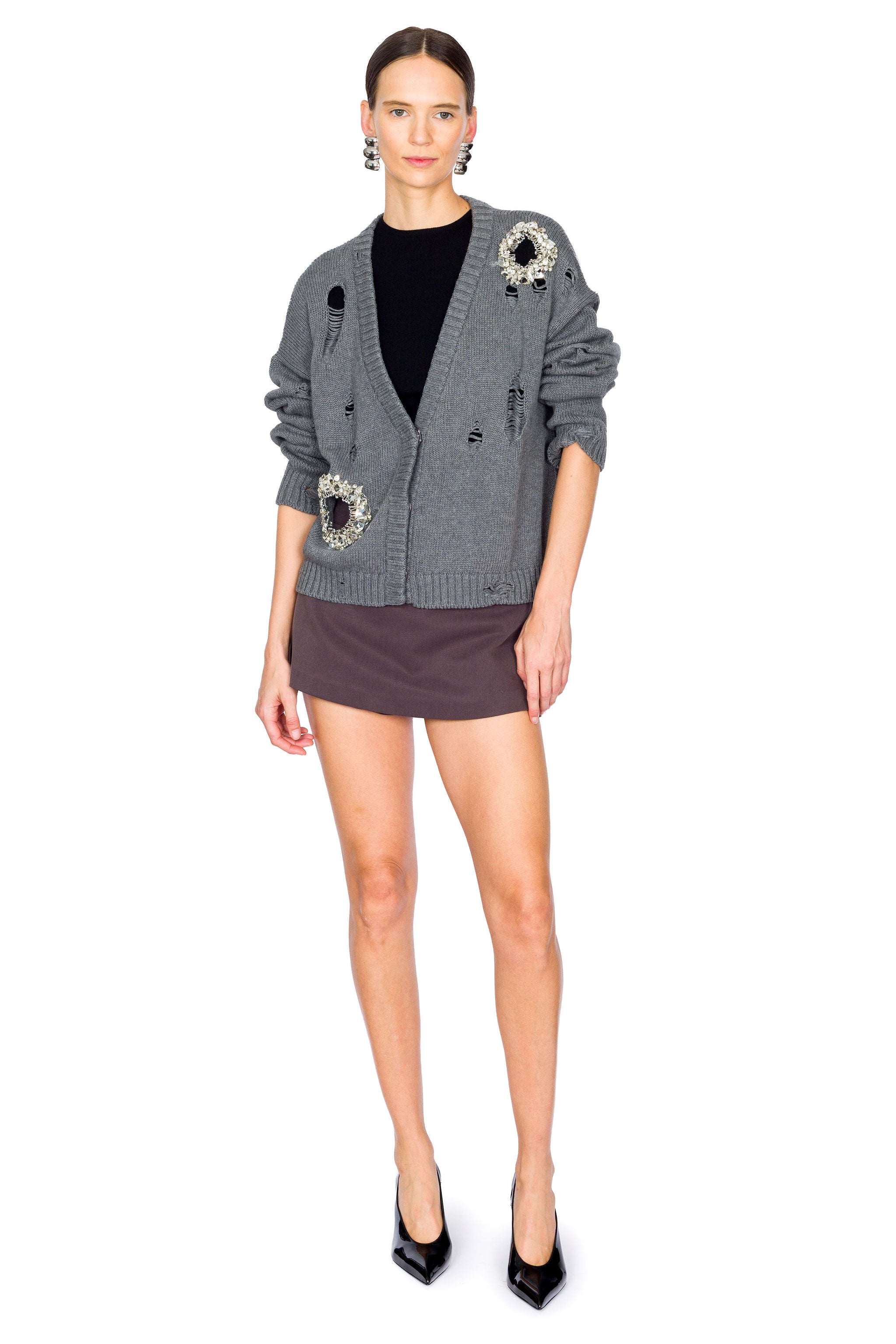 Elevate your wardrobe with this AREA cashmere blend cardigan, featuring delicate distressed crystal embellishments for a refined, yet edgy look. The front snap button closure offers effortless styling, making it a versatile piece that blends luxury and modern sophistication. Perfect for layering or as a statement on its own.