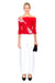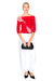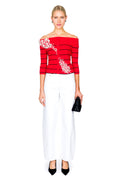 Red off-the-shoulder cardigan with horizontal stripes and pearl embellishments along the neckline. Versatile enough for casual or dressed-up occasions, this piece brings understated luxury to any wardrobe.