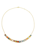 A vibrant 14K gold beaded necklace featuring a curated collection of precious gemstones including amethyst, topaz, turquoise, citrine, opal, tourmaline, garnet, coral, and pearl. The thoughtfully composed blend of colors creates a versatile statement piece that bridges classic elegance with contemporary style.