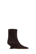 The Nina Ankle Boot Suede boasts rich dark brown suede leather and the iconic Paris Texas wedge heel, blending timeless elegance with a distinctive edge for a sophisticated statement.