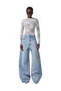 Classic denim trousers designed for effortless style. Features a low waistband with belt loops for a relaxed silhouette, paired with a front closure accented by a logo button. The wide baggy leg creates a contemporary, oversized look that works with everything from casual tees to dressed-up pieces. Perfect for those who prioritize comfort without compromising on fashion-forward appeal.