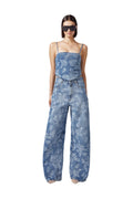 Wide-leg denim trousers crafted with a subtle floral print that adds understated elegance to your everyday wardrobe. The relaxed silhouette offers comfort and movement while maintaining a polished, contemporary look. Perfect for styling with the matching Denim Bustier Top or layering with your favorite pieces for a complete ensemble. Pair it with the matching Denim Bustier Top.