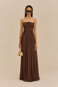 The Ritz Dress epitomizes timeless elegance with its strapless silhouette crafted from luxurious silk pebbled chiffon. Delicate gathering at the bodice creates dimension and movement, while a refined halter tie adds a touch of understated sophistication. The fluid skirt flows gracefully with a dramatic high leg slit, striking the perfect balance between allure and refinement. Ideal for evening events, galas, or any occasion demanding polished glamour.