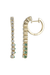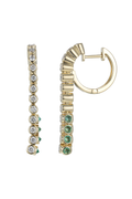 Tubbo Sideway Long Emerald and Diamond Earrings showcase round diamonds in gold cylinders with cascading emeralds along the sides. Set in 14K gold with comfortable huggie backings, these refined earrings blend timeless luxury with modern design for any occasion.