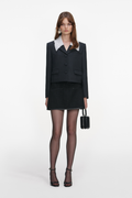 This grey wool jacket combines timeless style with modern appeal. A delicate broderie anglaise collar adds artisanal detail, while the boxy, cropped cut offers versatile sophistication. Layer it over dresses, pair with denim, or style with a pencil skirt for polished refinement. A wardrobe essential that works across seasons.