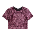 This boxy cropped t-shirt features shimmering pink sequins covering the entire garment, adding a touch of sparkle to your look. A subtle gemstone detail on one shoulder enhances its elegant yet playful design, making it perfect for stylish casual wear or special occasions. Pair it with the Crystal Cluster Sequin Mini Skirt for a fabulous look.