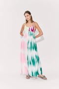The High Garden Maxi Dress by Rosie Assoulin showcases vibrant tie-dye poplin cotton for a fresh, elegant look. Designed with self-tie straps, a button-front placket, and discreet side pockets, this dress combines style and practicality in a flowing silhouette perfect for any occasion.