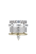 A refined four-ring stack set blending gold and white gold with a pear-shaped diamond centerpiece, baguette-cut white sapphires, and pavé detailing. The mixed metal design creates an elegant, multidimensional look that balances sophistication with striking visual impact.
