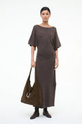 The Amelie Sweater Dress combines timeless elegance with modern comfort. Crafted from a luxurious wool blend, this boat neck maxi features graceful dolman sleeves that drape beautifully. Strategic ruching at the hips and low center back creates a refined silhouette that flatters the figure while maintaining an effortlessly chic aesthetic. Perfect for elevated everyday wear or sophisticated occasions.