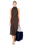 The Lillian Top combines timeless elegance with contemporary style. This brown and white pinstriped tank features a sophisticated draped halter neckline that creates a flattering silhouette and effortless refinement. The classic pinstripe pattern adds visual interest while maintaining versatility, making it an ideal piece for layering or wearing solo. Perfect for elevating your everyday wardrobe with understated luxury.