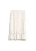 Knee-length skirt crafted from luxurious heavy satin with a distinctive raw edge waist and hem. A sheer gauze underlayer peeks through, adding an elegant, sensual dimension to the piece. The relaxed straight silhouette drapes beautifully while maintaining structure, finished with a concealed side zipper for a seamless silhouette. Perfect for layering or wearing solo. Style it with the V Neck Satin Pullover Top.