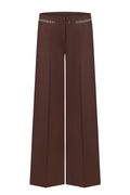 The Adalina Flared Pants in brown offer a wide-leg fit with a silver chain belt detail. Wear them with a simple tee or cropped sweater for an easy, stylish outfit.