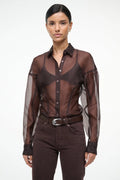 The Aida Top Earth is a delicate silk organza blouse with a sheer, lightweight design. Its classic button-down style offers elegant layering or a refined look on its own, perfect for both formal and everyday wear.