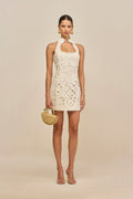 Elevate your style with the Akaia Dress, featuring a high collar and structured faux leather design. This mini dress showcases delicate lace-like cutouts, adding a refined touch to its sleek silhouette. Sleeveless with a racerback and a convenient side zip, it offers both comfort and an impeccable fit. Crafted from smooth PU leather, the Akaia Dress brings a sophisticated edge to any evening ensemble.