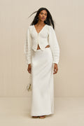 The Blair Knit Cardigan offers a sophisticated blend of style and comfort with its structured ribbed knit and distinctive angular hem. Featuring oversized, voluminous sleeves with adjustable cuffs, it provides a refined silhouette that can be worn open or closed. Accented by elegant stone buttons, this versatile piece elevates any wardrobe with effortless grace.
