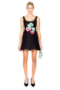 This striking mini babydoll dress combines timeless elegance with contemporary flair. Crafted from heavy satin, the silhouette features a flattering fit that transitions from fitted bodice to a gently flared skirt. The standout element is the three-dimensional floral appliqué adorning the bodice—meticulously layered petals create depth and visual interest, elevating the piece from simple to statement-making. The rich black fabric provides a refined backdrop that allows the dimensional florals to command attention. Perfect for evening events, upscale gatherings, or anyone seeking a dress that balances sophistication with artistic detail.