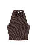 The Lillian Top combines timeless elegance with contemporary style. This brown and white pinstriped tank features a sophisticated draped halter neckline that creates a flattering silhouette and effortless refinement. The classic pinstripe pattern adds visual interest while maintaining versatility, making it an ideal piece for layering or wearing solo. Perfect for elevating your everyday wardrobe with understated luxury.