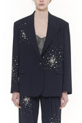 Elevate your wardrobe with this oversized navy blazer, exquisitely detailed with bursts of crystal embellishments. Its relaxed silhouette combines comfort with refined elegance, while the sparkling accents add a subtle touch of sophistication, perfect for making a polished statement at any event or gathering.