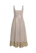 The Pistilo Midi Dress epitomizes refined elegance with its luxurious linen construction finished in a subtle gold coating. A fitted bodice and graceful square neckline frame the silhouette, while intricate embroidery adorns the hem with understated artistry. The voluminous skirt flows with timeless poise, creating a dress that transitions seamlessly from daytime sophistication to evening occasions.