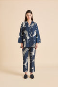 Jewelled-collar leopards stride across blue cotton-silk in our Ziegfeld print, a design inspired by the glamorous 1930s soirées of Elsie de Wolfe, the legendary tastemaker known for her impeccable aesthetic. The Casablanca silhouette delivers effortless sophistication—tailored enough for evening elegance, comfortable enough for restful nights. Crafted from a luxurious cotton-silk blend, this set captures old-world glamour with modern wearability.