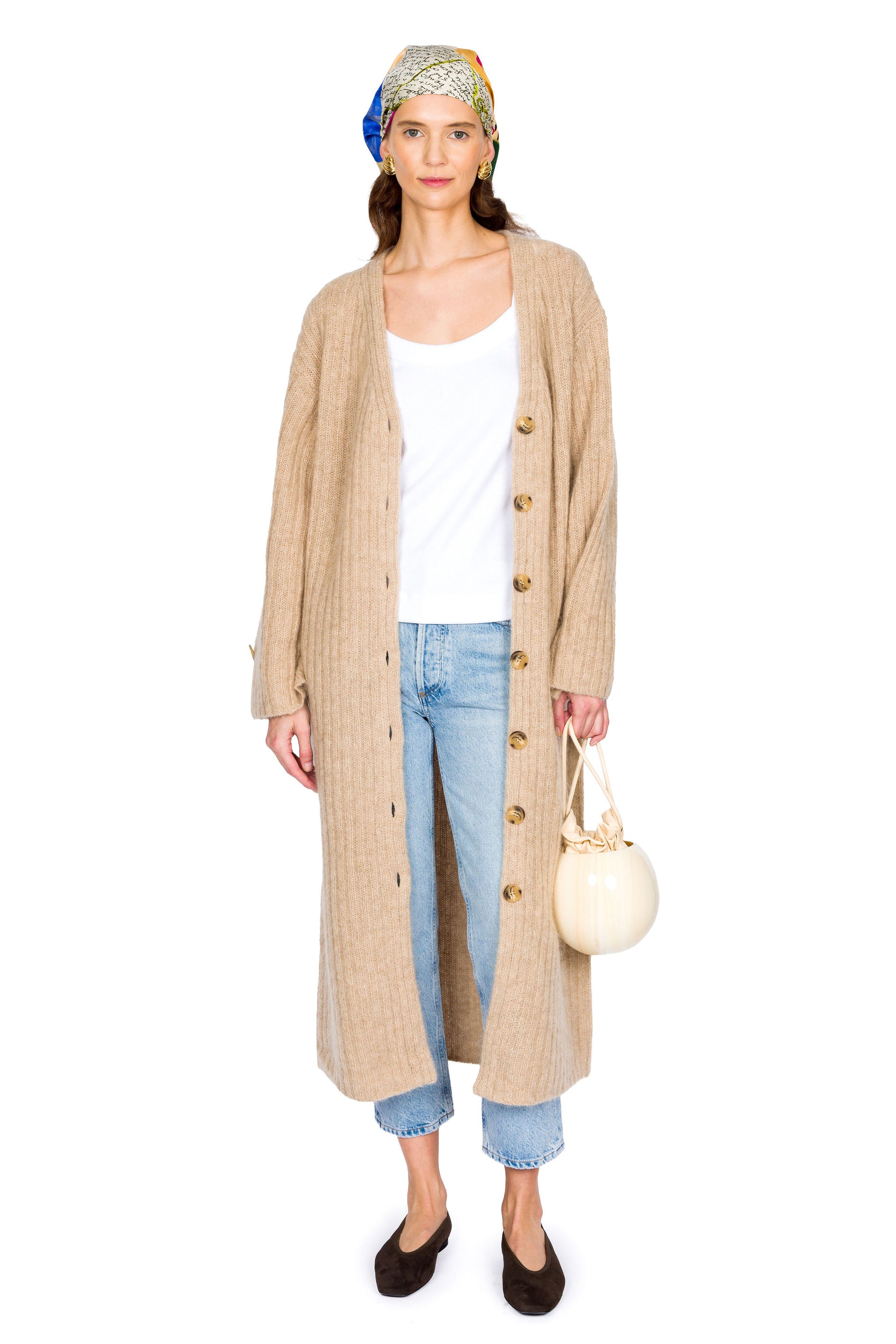 The Cimonello Cardigan offers elegant comfort with its warm wool and mohair blend. Its neutral color and classic V-neck with button closure make it a versatile layering piece or a cozy maxi dress, ideal for sophisticated style all year.