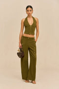 The Davey Top combines architectural tailoring with modern edge. This fitted halter style features structured twill that holds its shape, with contoured seaming that sculpts the silhouette. An exposed center-front zipper adds functional detail and visual interest, while the cropped length keeps the look contemporary. Perfect for layering or wearing solo, this piece transitions effortlessly from day to evening.