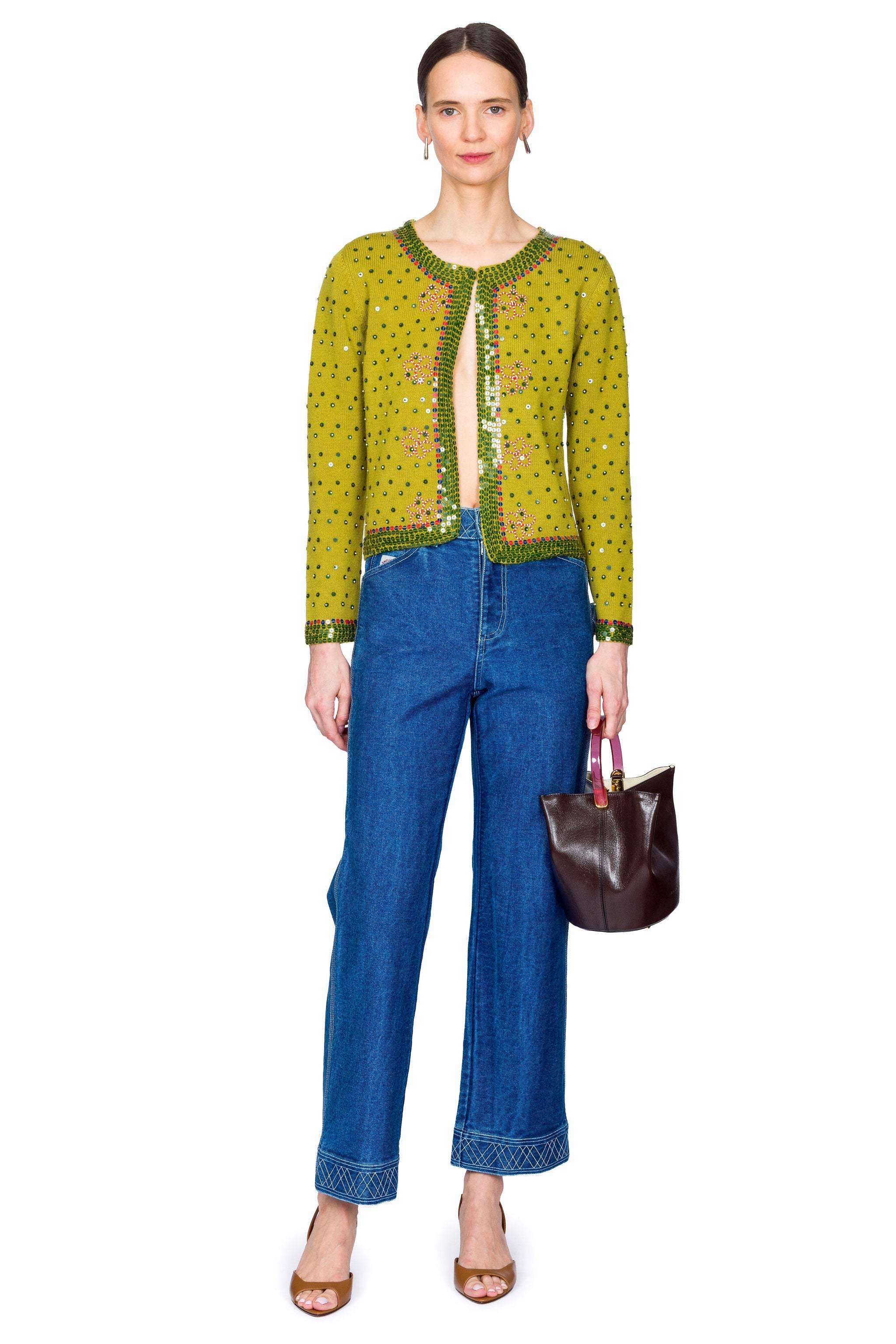 Inspired by a vintage European workwear smock from Emily's curated collection, these denim trousers honor heritage craftsmanship through thoughtful design details. The signature white geometric embroidery and red monogram—originally featured on the historic piece—are faithfully reproduced along the waistband and hem. Branded with the "Knolly Brook, a Bode Product" label at the front right pocket, these trousers blend timeless workwear aesthetics with contemporary tailoring. A refined choice for those who appreciate garments with a story.