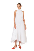 Effortless drama, done the Rosie way. The Dropped & Dramatic Dress in white Swiss pique cotton balances clean lines with sweeping movement, cut with a sculptural halter neckline and a softly structured silhouette.A drop waist gives way to an asymmetric, voluminous skirt that moves beautifully with every step, while the textured pique keeps the look crisp and modern. Finished with pockets and a line of buttons down the back, it's equal parts polished, playful, and quietly striking.