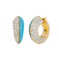 These yellow gold huggie earrings feature a unique design with one side showcasing vibrant turquoise and the other side adorned with sparkling diamonds. Their elegant contrast offers a refined yet modern look, perfect for adding a subtle touch of sophistication to any outfit.