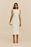 The Meri Dress combines architectural elegance with wearable artistry. This midi silhouette features a tailored base paired with a hand-crocheted sponge-yarn poncho adorned with pearl accents that gracefully drapes over the shoulders. The poncho detaches effortlessly, allowing you to transition from layered sophistication to streamlined minimalism. Perfect for those who appreciate sculptural design and versatile styling that adapts to any occasion.