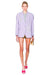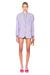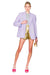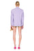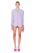 Woman wearing a light purple blazer with embellishments on a white background.