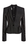 This Palmas Pierced Blazer offers a modern twist on classic tailoring with its sharp lines and defined waist. Silver piercings elegantly accent open slits along the sleeves and torso, creating a striking interplay of precision and edge. Designed to sculpt the silhouette, this blazer balances refined structure with bold details for a sophisticated yet daring look.