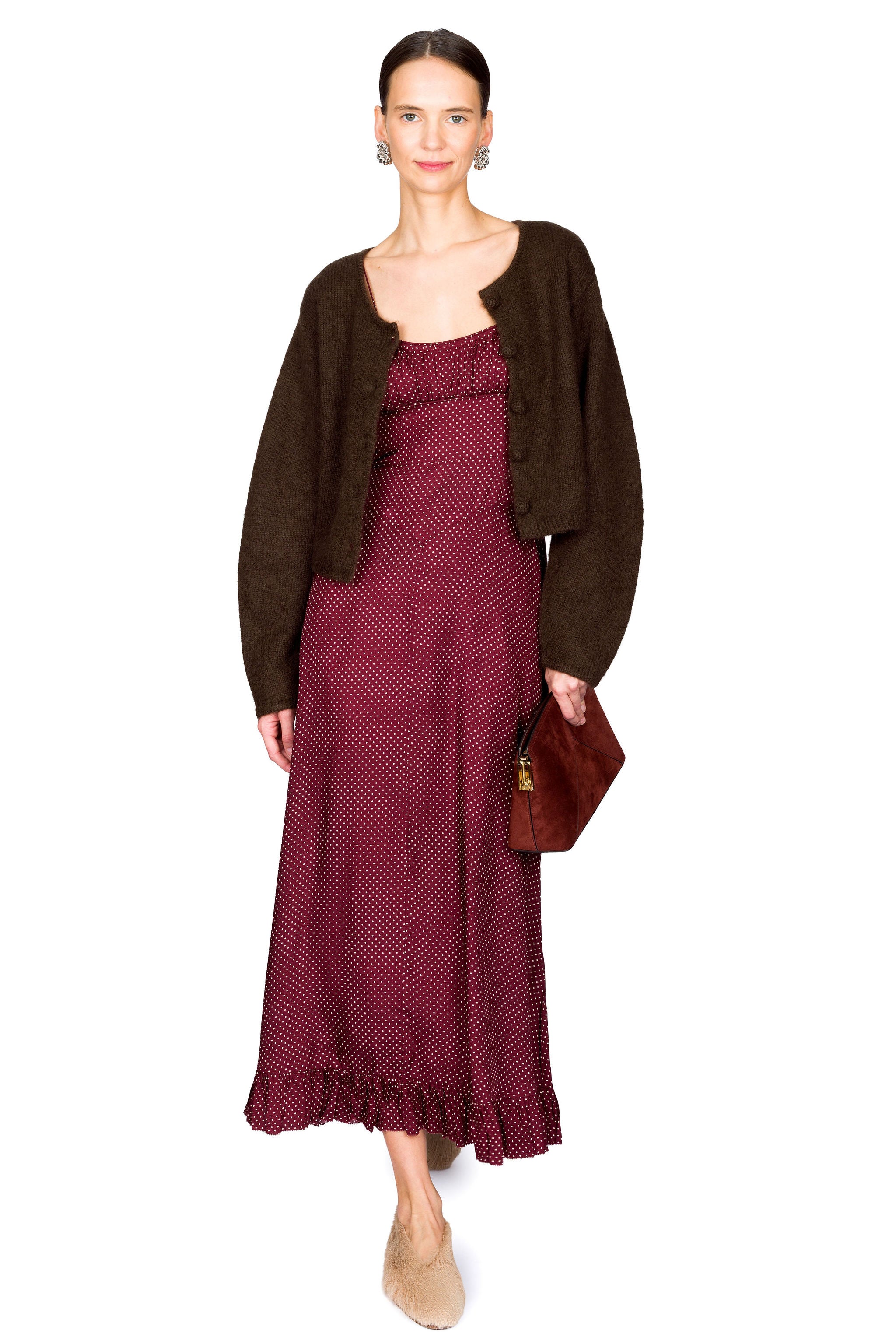 Crafted from a luxurious silk blend, the Rosaria Dress features delicate celebratory dots and slender straps for an elegant silhouette. Its sleeveless design and flared, frill-trimmed skirt create a graceful flow, making it perfect for transitioning seamlessly from day to evening occasions.