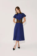 The Sands Through the Hourglass Dress features a structured shape with cap sleeves and a sheer mesh waist. Its ridged moire fabric adds subtle shine, and the flared midi skirt moves gracefully. This elegant design combines classic style with a modern touch, perfect for Fall.