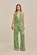 Woman wearing a green wide leg pant with velvet and silk burnout patterns and gold details, paired with a matching top.