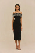 The Suzie Dress combines refined elegance with contemporary style. This midi-length piece features a luxurious knit rayon fabrication that drapes beautifully, while the off-shoulder neckline creates a graceful, feminine silhouette. Delicate faux pearls embellish the neckline, adding a touch of understated glamour perfect for evening occasions or elevated everyday wear. A versatile wardrobe essential that transitions effortlessly from season to season.