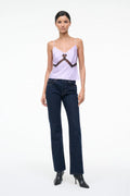 The Terra Silk Top combines effortless elegance with refined details. Crafted from luxurious stretch silk satin, this slip cami features delicate spaghetti straps and intricate lace cutouts at the bust for a touch of understated sophistication. The fluid fabric drapes beautifully while maintaining its shape, making it an ideal layering piece or standalone essential for any refined wardrobe.