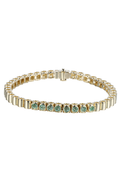 A refined tennis bracelet featuring round emeralds set in 14K gold cylinders. The .54CT of emerald stones deliver modern sophistication, whether layered with other pieces or worn alone. Effortlessly transitions from daily wear to special occasions.