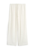 Elevated drawstring trousers crafted from a luxurious viscose and linen blend, featuring subtle raised stripes that add textural depth. The fluid fabric drapes beautifully while the relaxed wide-leg silhouette offers effortless comfort. Designed with a drawstring waist for adjustable fit and practical side and back pockets. Perfect for layering or wearing solo, these meringue-toned trousers bring an artisanal touch to any wardrobe.  Pair it with the matching Woven Stripe Top